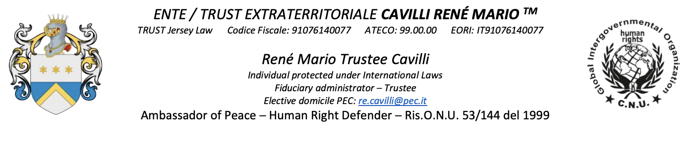 This Agreement is governed, regulated, and interpreted in accordance with the Law of Jersey, to which the Extraterritorial Entity CAVILLI RENÉ MARIO has entrusted its legal system. For any dispute that may arise concerning the validity, effectiveness, interpretation, and execution of these Terms, the exclusive jurisdiction shall be that of the Judge designated by the Prosecutor's Office of the Global Intergovernmental Organization CNU, of which the Extraterritorial Entity CAVILLI RENÉ MARIO is a regular Member.
